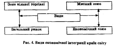 Розвиток економічної інтеграції країн світу й надалі буде поширюватись і виступати в найрізноманітніших формах тому, що це магістральний шлях в майбутнє планетарної цивілізації. Нині найбільш поширеними є види економічної інтеграції, представлені на рис4.