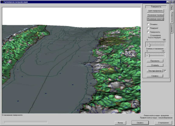 Раздел содержит также функцию сглаживания поверхности. Определите параметры сглаживания: число итераций и степень сглаживания. Нажмите кнопку Применить. Запускается процедура сглаживания поверхности. При этом отображение объектов остается неизменным. Для того, чтобы объекты "привязать" к новой сглаженной поверхности нужно выполнить команду Обновить в разделе Объект MapInfo.
