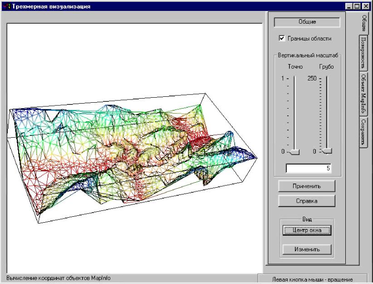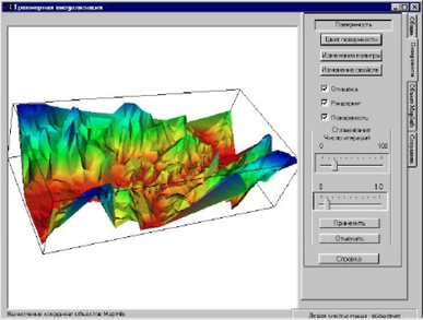 Слева находится окно вида, в котором отображается трехмерная модель поверхности. В окне вида при помощи левой кнопки мыши можно изменять угол наклона и поворота модели, правой – масштаб вида. В правой части диалога находятся настройки показа трехмерной модели: