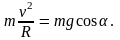 Чтобы от векторного уравнения (1) перейти к скалярным соотношениям, введём ось Х, направленную вдоль радиуса. Тогда ax = an = v2/R. На основании уравнения (1) mv2/R = mghcosα – N. В точке отрыва от сферы an = v2c/R, N=0, следовательно ,