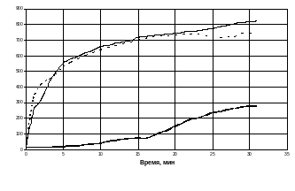Рис. 2. Данные испытания многослойной конструкции на основе геля г2: 1-температура внутри печи по ГОСТ; 2-фактическая температура внутри печи; 3-температура наружного стекла
