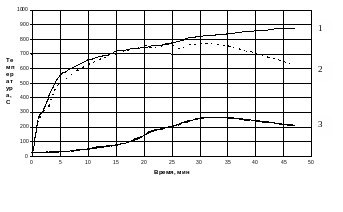 Рис. 1. Данные испытания многослойной конструкции на основе геля г1: 1-температура внутри печи по ГОСТ; 2-фактическая температура внутри печи; 3-температура наружного стекла