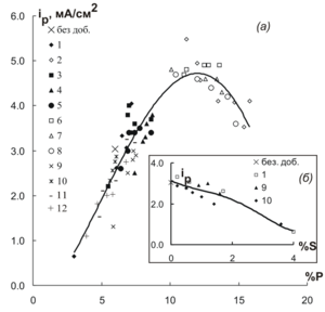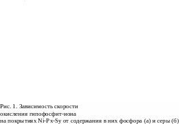 Рассмотрим, как каталитические свойства Ni,P-сплавов коррелируют с их составом. На рис.1, а представлена зависимость скорости окисления Н2РО2- от содержания фосфора в покрытии. Видно, что в данном случае каталитическая активность поверхности вначале возрастает с ростом содержания фосфора до 10-12%, а затем наблюдается ее снижение. Каталитические свойства поверхности также зависят от включения в покрытие серы (рис. 1, б). В малых количествах сера способствует увеличению или незначительному уменьшению скорости исследуемого процесса, а повышение ее содержания в покрытии (более 3 %) приводит к отравлению каталитической поверхности.