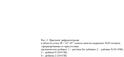 Все это приводит к снижению каталитической активности поверхности. Повышение электрокаталитической активности никелевого электрода при включении малых количеств фосфора объясняется, по-видимому, изменением геометрической структуры поверхности: в присутствии органических добавок (как правило, азотсодержащих и серосодержащих при низких концентрациях) формируются осадки с меньшим размером зерна, сохраняющие более высокую степень кристалличности по сравнению с растворами без добавок (рис. 2, кр. 3, 4). Дальнейшее снижение скорости процесса при увеличении содержания фосфора больше 12% обусловлено аморфизацией покрытия.