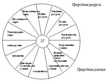 В верхней части круга находятся природные ресурсы, которые нам необходимо оценить по той же пятибалльной шкале, как и в случае факторной оценки, которую мы проводили выше. В нижней части круга представлены природные условия, которые необходимо оценить по следующей шкале: