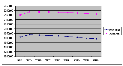 Как мы можем заметить, численность населения в последние годы все время снижается. Что не характеризует регион с благоприятной стороны. Это можно объяснить сложившимся неблагополучным соотношением между рождаемостью и смертностью и характером демографических процессов в прошлом, изменениями в возрастной структуры населения и семейно-брачных показателей. Численность мужчин меньше численности женщин. Это в свою очередь увеличивает количество неполных семей.