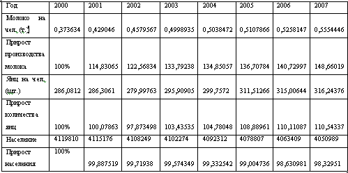 Рассчитываем сколько молока и яиц ежегодно приходится на человека. А затем, взяв 2000г. за базовый год рассчитываем прирост населения и прирост пищевых ресурсов.
