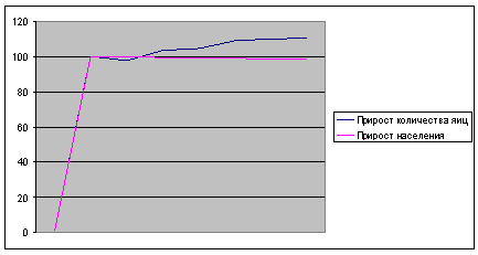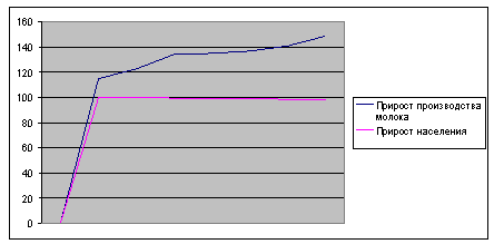 Строим кривые. В последние годы кривая производства как молока, так и яиц находится выше кривой населения. При этом необходимо отметить, что не наблюдается колебаний, тенденция устойчивая и в первом, и во втором случае. Все это свидетельствует в целом о благоприятной ситуации. Однако, следует учитывать тот факт, что количество населения у нас постоянно снижается. И делать однозначные выводы на данном этапе исследования рано. Нужны дополнительные исследования.