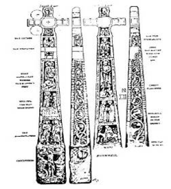 The best known runic insctiptions in England are the earliest extant OE written records. One of them is an inscription on a box called the “Franks Casket”, the other is a short text on a stone cross in Dumfriesshire near the village of Ruthwell known as the “Ruthwell Cross”. Both records are in the Northumbrian dialect.