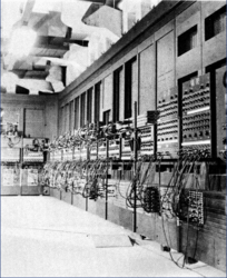Первой действующей ЭВМ стал ENIAC (США, 1945 - 1946 гг.). Его название по первым буквам английских слов означает “электронно-числовой интегратор и вычислитель". Руководили ее созданием Джон Моучли и Преспер Эккерт, продолжившие начатую в конце 30-х годов работу Джорджа Атанасова. Машина содержала 18 тысяч электронных ламп, множество электромеханических элементов. Ее энергопотребление равнялось 150 кВт, что вполне достаточно для обеспечения небольшого завода.