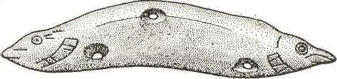 Рис. 4. Каменная скульптура-приманка в виде янусовидного изображения рыбы. Использовалась для подледного лова рыбы. Около 7 тыс. лет назад