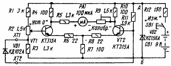 Налаживание собранного термометра начинают с проверки потребляемого им тока. К зажимам ХТ1 и ХТ2 подключают диод-датчик, а к точкам А и Б-батарею 3336 (через миллиамперметр на 30-50 мА). Стабилитрон VD2 временно отключают. Стрелка миллиамперметра должна показать ток 10...20.. мА, что укажет на исправность прибора.