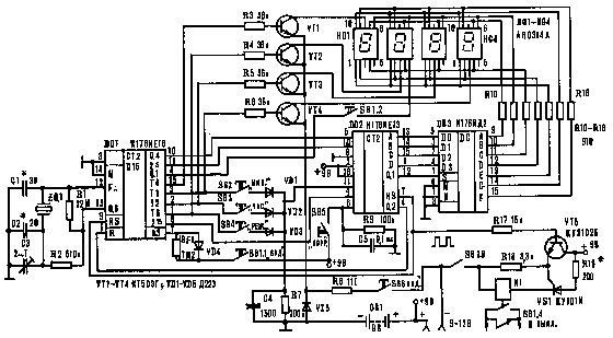 Интегральная микросхема К176ИД2 содержит преобразователь сигналов двоично-десятичного кода в сигналы управления семисегментными индикаторами. Она включает в себя также триггеры, позволяющие запомнить сигналы входного кода. Микросхема имеет четыре индикаторных входа (D0-D3) для подачи сигналов в коде 1-2-4-8 и три управляющих входа М, К, S (6, 7, 1). Вход М определяет полярность выходных сигналов: при 0-на выходе 1 и наоборот. При 0 на входе К разрешена индикация. Вход S управляет работой триггеров памяти: при уровне 1 на нем триггеры превращаются в повторители и изменение сигналов на входах D0-D3 соответственно изменяет выходные сигналы. Если же на входе S присутствует уровень 0, то сигналы, имевшиеся перед этим на входах D0-D3, запоминаются и микросхема на их изменение не реагирует. Ток короткого замыкания на выходах DD3 примерно равен 9 мА при напряжении питания 9 В. Они соединены через токоограничивающие резисторы R10-R16 с выводами семисегментного индикатора АЛС314А или аналогичным. Соответствующие аноды всех четырех разрядов индикатора объединены и соединены с выходами дешифратора, а катоды связаны с выходами Т1-Т4 DD1 через ключи на транзисторах VT1-VT4. При среднем потреблении тока 10 мА индикатор обеспечивает в помещении достаточную яркость свечения. В случае использования таймера на улице в солнечную погоду индикатор необходимо углубить в корпусе прибора и установить красный светофильтр. Желательно при этом уменьшить величины резисторов R8 или R10-R16.