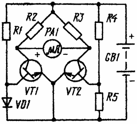 Затем проверяют действие переменного резистора R2, устанавливая им стрелку индикатора на отметку 20 мкА при нормальной окружающей температуре (20 °С). После этого, зажав в руке датчик, наблюдают ЗА увеличением показаний стрелочного индикатора. Если они, наоборот, падают, изменяют полярность включения микроамперметра.