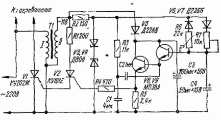 Протекание тока через тринисторы и через нагреватель при заданном сопротивлении резистора R7 обусловлено сопротивлением терморезистора R6. С повышением температуры сопротивление терморезистора понижается, увеличивается ток разряда конденсатора С4 через терморезистор и диод V6, а напряжение на конденсаторе уменьшается.