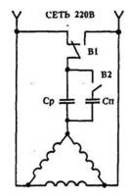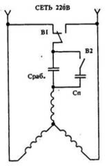 Чтобы двигатель с конденсаторным пуском работал нормально, емкость конденсатора должна меняться в зависимости от числа оборотов. Поскольку это условие трудновыполнимо, на практике управляют двигателем двухступенчато. Включают двигатель с расчетной (пусковой) емкостью, оставляя рабочую. Пусковой конденсатор отключают вручную переключателем В2.