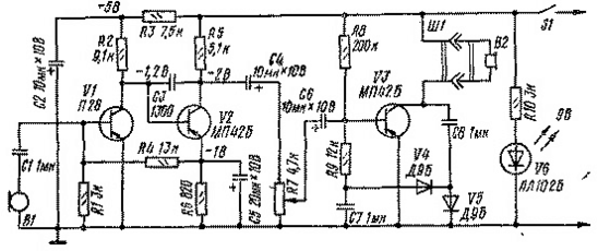 Усилитель аппарата выполнен на трех транзисторах. Для стабилизации коэффициента усиления первые два каскада охвачены отрицательной обратной связью по постоянному току. С резистора R7, выполняющего роль регулятора усиления, сигнал через разделительный конденсатор С6 поступает на базу транзистора V3, на котором собран усилительный каскад с плавающей рабочей точкой. Это уменьшает потребляемый ток в режиме молчания до 7 мА