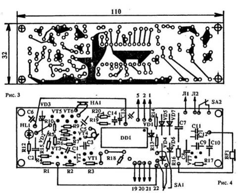 Схема аппарата собрана на односторонней печатной плате (рис.3, 4) размерами 110 х 32 мм.