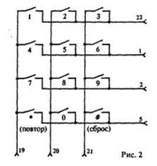 На рис.2 изображена кнопочная матрица, номера выводов которой соответствуют номерам выводов микросхемы D1.