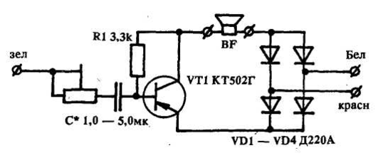 На транзисторе VT7 собран электронный звонок, который можно отсоединять выключателем SA2. В качестве излучателя звонка применен микрофонный капсюль ДЭМШ-1А.