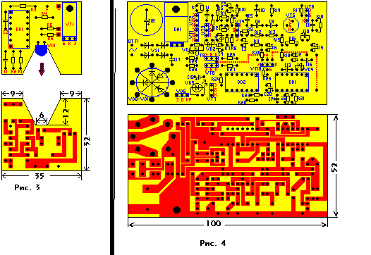 Печатная плата приведена на рис.3. Её предлагается изготовить из двухстороннего фольгированного стеклотекстолита толщиной 1,5 мм. Фольга со стороны деталей (на рисунке не показана) выполняют функцию общего (минусового) провода источника питания. Вокруг отверстий для пропускания выводов деталей в фольге вытравлены участки диаметром по 1,5...2 мм. Выводы деталей, соединённых с общем проводом, припаивают непосредственно к фольге этой стороны платы. Транзистор VT1 крепят к плате винтом М3, без какого либо теплоотвода. Оптическая ось ИК диода VD1 должна быть параллельна плате, и отстоять от неё на 5 мм.
