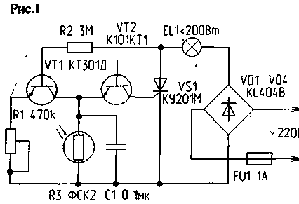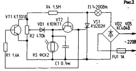 Управление работой тиристора осуществляется от релаксационного RC-генератора, выполненного на лавинном транзисторе VT2 (К101КТ1). В начальный момент времени заряд конденсатора С1 осуществляется от положительного полупериода напряжения, снимаемого с анода тиристора VS1 через резистор R2 и транзистор VT1 (рис. 1) или резисторы R2 и R4 и диод VD1 (рис. 2). Параллельно конденсатору С1 подключено сернистокалиевое фотосопротивление типа ФСК-2, сопротивление которого в темноте превышает 3 МОм. Таким образом, если фоторезистор находится в затемненной зоне (при отсутствии оптической связи между светоизлучателем EL1 и фоторезистором R3), последний почти не шунтирует конденсатор С 1. Когда напряжение на обкладках конденсатора превышает 8 В, происходит лавинный пробой транзистора VT2 и разряд конденсатора на управляющий электрод тиристора VS 1. Тиристор на текущий полупериод напряжения сети открывается и на лампу накаливания подается напряжение сети. Для каждого последующего полупериода сетевого напряжения процесс повторяется. На лампе выделяется до 95% подводимой мощности, что характерно для всех типов тиристорных и симисторных регуляторов. Если освещенность фотосопротивления повышать, его сопротивление понижается до 200 и менее кОм. Поскольку фотосопротивление подключено параллельно накопительному конденсатору С1 генератора, его шунтирование приводит к снижению скорости заряда конденсатора и отсрочке момента включения тиристора. В итоге лампа накаливания в каждый полупериод начинает включаться с задержкой, пропорциональной уровню освещенности в точке нахождения фоторезистора. Соответственно суммарная освещенность стабилизирована на определенном (заданном) уровне. Потенциометр R1, включенный в эмиттерную цепь транзистора VT1 (рис. 1) или R2, подключенный параллельно участку коллектор-эмиттер транзистора VT1 (рис. 2), предназначены для задания максимального уровня освещенности и позволяют плавно регулировать указанный уровень.
