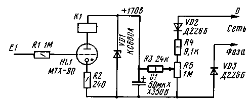 В анодную цепь тиратрона включено реле К1 (РЭС6 паспорт РФО.452.103), группа нормально разомкнутых контактов которого подсоединяется параллельно самоблокирующимся контактам реле музыкального звонка (или через эти контакты питают обычный квартирный звонок). Чтобы исключить ложные срабатывания сенсорного устройства и самопроизвольное зажигание тиратрона, введен параметрический стабилизатор напряжения, выполненный на стабилитроне VD1 и балластном резисторе КЗ. Постоянное питающее напряжение 170 В остается неизменным при колебаниях сетевого напряжения от 180 до 250 В.