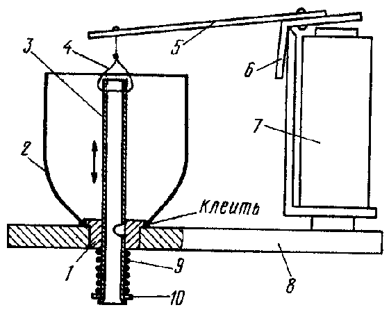 Сам дозатор состоит из конусообразного бункера 2 из тонкого металла (можно использовать корпус от аэрозольного препарата), приклеенного к цилиндрическому основанию 1 толщиной 5...7 мм и диаметром 15...20 мм. В основании - сквозное отверстие диаметром 5...7 мм, в котором свободно перемещаете тонкостенная трубка 3 с дозирующим отверстием в стенке. Снизу на трубку надета пружина 9, зафиксированная шайбой 10 и развальцованным (или оплавленным - для пластмассовой трубки) концом. Верхний конец трубки стальной проволочной тягой 4 соединен с рычагом 5, скрепленным с якорем 6 реле 7. Все контактные группы реле удаляют. Бункер и реле жестко скреплены с основанием 8 дозатора.
