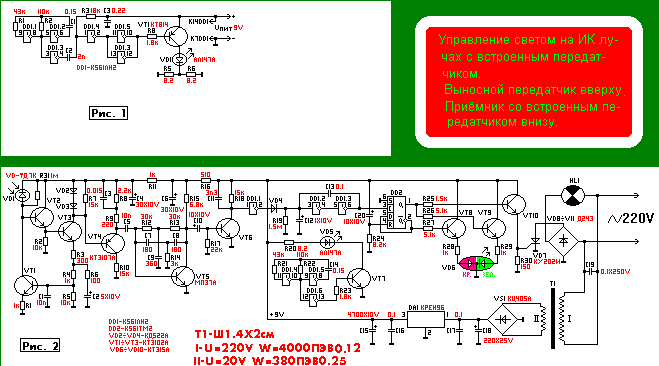 Достоинство дистанционного управления на ИК лучах (далее просто ДУ) все уже испытали на собственном опыте. ДУ вторглось в нашу повседневную жизнь и в достаточной мере экономит наше время. Но на данный момент, к сожалению, не на все электроприборы устанавливают ДУ. Это относиться и к выключателям света. Нашей промышленностью, правда, на данный момент выпускается такой выключатель, но стоит он не маленькие деньги, да и найти его очень и очень сложно. В этой статье предлагается довольно простая схема такого выключателя. В отличие от промышленной, которая включает в себя одну БИСку, она в основном собрана на дискретных элементах, что, конечно, увеличивает габариты, но зато в случаи необходимости легко подвергается ремонту. Но если гнаться за габаритами, то в этом случаи можно использовать планарные детали. Эта схема также обладает и встроенным передатчиком (в промышленных его нет), что избавляет вас от надобности всё время носить с собой пульт или искать его. Достаточно поднести к выключателю руку на расстоянии до десяти сантиметров как он сработает. Ещё одно преимущество заключается в том, что к ДУ подходят любые пульты от любой импортной или отечественной радиотехники.