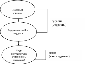 Они любят весь мир, но мир, этот большой мир, их не понимает. Они задают этому большому миру вопрос: Почему? Люди, что с нами происходит? Вот тут-то и происходит нравственное размежевание двух сред (город-деревня), и появляется третий тип «чудика», или иначе его можно назвать «античудиком», которому посвящена следующая глава нашей дипломной работы.