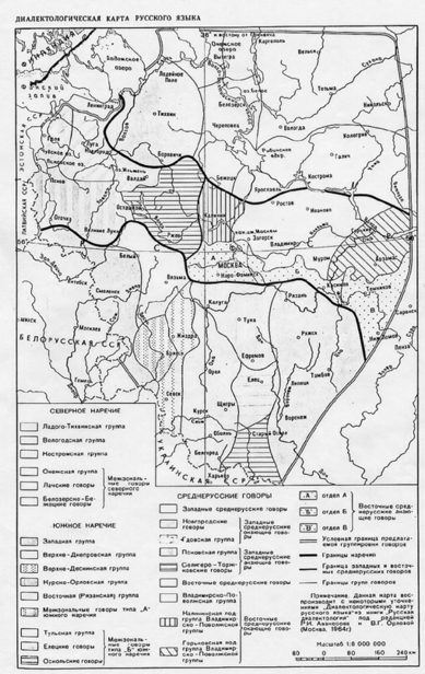 В 1965 г. выходит новая «Диалектологическая карта русского языка » (см). Она существенно отличается от первого «Опыта» (исходным материалом, изучением всех явлений языка, привлечением специалистов, использованием систематических методов ЛГ и т.д.).