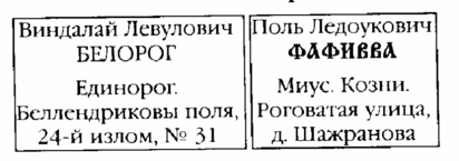 «Фамилия» Фафивва была для особой выразительности набрана церковно-славянским шрифтом с двумя, в то время уже не употреблявшимися буквами – фитой и ижицей. К нему (А. Белому) чуть не вызвали психиатра. Этими карточками Белый хотел создать особую атмосферу, в которой игра (смешные, вымышленные имена и адреса) и мифические персонажи (единорог, а на других карточках – кентавры, карлики и пр.) становились частью окружающего реального мира. Ведь отпечатанные в типографии визитные карточки приходили по настоящей почте или их приносил посыльный. Быть человеком круга всех московских символистов значило не отрицать возможности существования единорогов в московских закоулках.