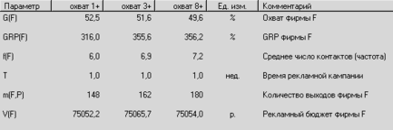Из сказанного ясно, что чем больше TRP и OTS, тем большая аудитория имеет шансы увидеть (услышать) рекламу хотя бы один раз в течение кампании, и тем большее число людей из этой аудитории увидит ее более одного раза. Таким образом, показатель 5 - один из основных параметров для сопоставления разных вариантов медиапланов [17].