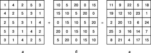 Метод Ф.де ла Ира (1640–1718) основан на двух первоначальных квадратах. На рис. 5 показано, как с помощью этого метода строится квадрат 5-го порядка. В клетку первого квадрата вписываются числа от 1 до 5 так, что число 3 повторяется в клетках главной диагонали, идущей вправо вверх, и ни одно число не встречается дважды в одной строке или в одном столбце. То же самое мы проделываем с числами 0, 5, 10, 15, 20 с той лишь разницей, что число 10 теперь повторяется в клетках главной диагонали, идущей сверху вниз (рис. 5,б). Поклеточная сумма этих двух квадратов (рис. 5,в) образует магический квадрат. Этот метод используется и при построении квадратов четного порядка.