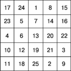 Магические квадраты нечетного порядка можно построить с помощью метода французского геометра 17 в. А.де ла Лубера (сиамский метод). Рассмотрим этот метод на примере квадрата 5-го порядка (рис. 4). Число 1 помещается в центральную клетку верхней строки. Все натуральные числа располагаются в естественном порядке циклически снизу вверх в клетках диагоналей справа налево. Дойдя до верхнего края квадрата, продолжаем заполнять диагональ, начинающуюся от нижней клетки следующего столбца (по ломаной диагонали). Дойдя до правого края квадрата, продолжаем заполнять диагональ, идущую от левой клетки строкой выше. Дойдя до заполненной клетки или угла, траектория спускается на одну клетку вниз, после чего процесс заполнения продолжается.