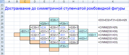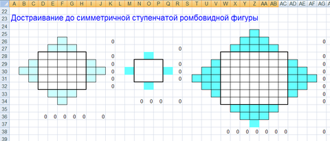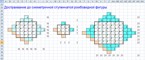В ходе экспериментальной части по способу достраивания до симметричной ступенчатой ромбовидной фигуры, мы заметили, процесс переноса чисел, вышедших за поле квадрата, также можно автоматизировать.