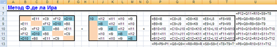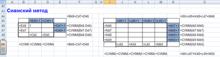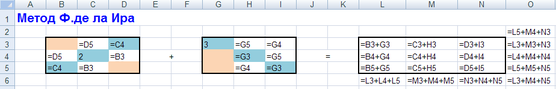 Используя функцию автосуммирования, мы подготовили шаблоны для вычисления контрольных сумм магических квадратов 3, 5 и 7 порядка по каждому из методов. А для метода Ф.де ла Ира еще и вычисление элементов третьего квадрата, как сумм соответствующих элементов первых двух квадратов.