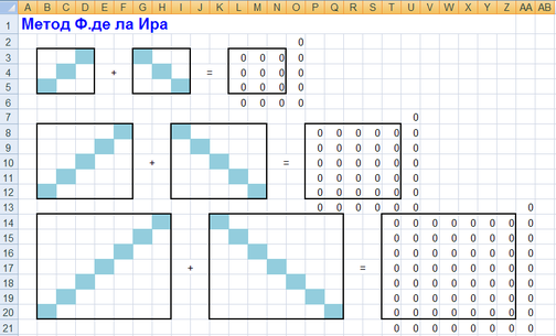 В ходе экспериментальной части по методу Ф.де ла Ира , мы заметили, что в первых двух квадратах, элементы на ломаных диагоналях равны, и пришли в выводу, что процесс заполнения этих квадратов можно также автоматизировать. Достаточно указать только по одному элементу на каждой из ломаной диагонали.