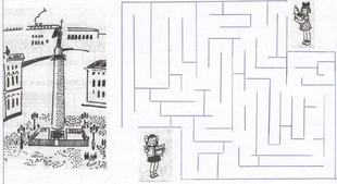 Воспитатель. Молодцы! Теперь выберите по одному человеку из команды, которые умеют выходить из запутанных лабиринтов. Возьмите, пожалуйста, конверты, а я объясню, что нужно делать. Две подружки договорились встретиться у Александровской колонны. Катя пришла первой. Помогите Наташе добраться к назначенному месту.