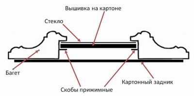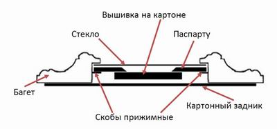 показана в разрезе сборка вышивок с паспарту и без. В таком варианте небольшую работу можно собрать и дома, только нужно заказать в багетке всё необходимое (раму, стекло, паспарту, две картонки – одна для натяжки вышивки, другая для задника) в комплекте. При самостоятельной «закупорке» вышивки дома в готовую раму задник тоже будет вкладываться внутрь,
