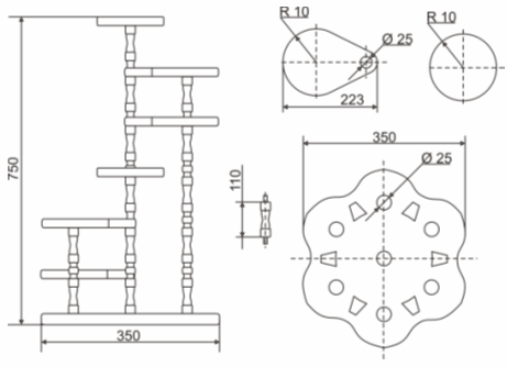 Каждая из представленных цветочниц мне очень понравилась. И я решил, взяв с каждой по элементу, создать своё новое, не повторимое. Моей идеей было изготовление цветочницы, почти похожей, той, что представлена на рисунке 2. Однако я решил, что четырёх ярусов для горшков с цветами не достаточно, и, подумав, я разработал чертёж для сбора цветочницы в семь ярусов. Большим удовольствием для меня является работа с древесиной. Значит и все стойки цветочницы я планировал изготовить из древесины. Тем более, что точёные стойки цветочницы будут кок раз подходить к интерьеру нашей комнаты. А именно я планировал выточить их по типу формы ножек стола и стульев, расположенного в нашем зале.