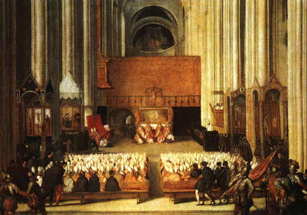 Справка: Триентский собор, вселенский собор католической церкви, заседавший в 1545-47, 1551-52, 1562-63 в г. Триент [нем. Trient, лат. Tridentum, современный Тренто (итал. Trento)], в 1547-49 - в Болонье. Был созван в связи с успехами Реформации по настоянию многих прелатов и императора Карла V (стремившегося покончить с религиозными раздорами в империи и реформировать церковь в духе требований соборного движения). Открыт римским папой Павлом III. Наметились 2 лагеря: лагерь, возглавлявшийся императором, настаивал на реформе церкви, искоренении злоупотреблений духовенства, считал допустимыми некоторые уступки протестантам в области догматики; лагерь папы настаивал на укреплении церковного единства в борьбе с реформационным движением, на решении догматических вопросов в строго ортодоксальном и традиционном духе, отвергал малейший компромисс в вопросах доктрины. Т. с. закончился победой папской партии. Его постановления закрепили все традиционные догматы католического вероучения. Т. с. усилил организационно католическую церковь: подтвердил верховенство папы над собором, увеличил власть епископов в пределах их диоцезов (расширив право надзора за духовенством), укрепил дисциплину монашеских орденов. Важнейшим результатом Т. с. было усиление гонений на протестантов, введение строгой церковной цензуры, расширение деятельности инквизиции. Стремясь подчинить своему влиянию духовную жизнь общества, католическая церковь обязала духовных лиц и профессоров католических университетов присягать обнародованному в 1564 "Тридентскому исповеданию веры", закреплявшему средневековые догматы католицизма. Постановления Т. с., формально обязательные для всех католиков, были официально приняты в Савойе, Португалии, Венеции, Польше (с 1577), Испании (с оговорками о сохранении прав короля на назначение епископов и на вмешательство в деятельность церковного суда). Во Франции они не были приняты официально, но французское духовенство в 1615 объявило о своём подчинении им. Решения Т. с. надолго определили деятельность католической церкви эпохи Контрреформации.