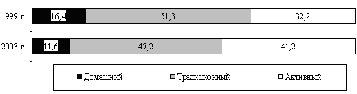 Как видно из рисунка 4, в реальных моделях досуговой активности бизнесменов происходят именно типологические, качественные изменения. Доля простых, традиционных форм досуга и отдыха постепенно снижается, уступая место более продвинутым, современным, разнообразным формам заполнения свободного времени. Это находит отражение в том, что активный внедомашний тип досуга с характерным для него множеством развивающих, развлекающих, культурных, рекреационных, общественных компонентов занимает все большее место в жизни российского предпринимательства. Активный внедомашний досуг характеризует уже практически половину его представителей.