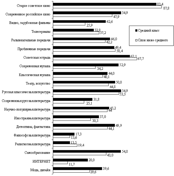 Рисунок2 Специфика духовных интересов среднего класса и слоев ниже среднего класса, в%