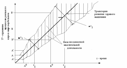 ис. 7. Тенденции развития возможных деформаций общественного сознания (искажение смысловых понятий и отношений между ними при отражении процессов объективной реальности проиллюстрированы следующими обозначениями: АО, БО, ВО,…- процессы «мира реального», А”, Б”, В”,.. - субъективное отражение объективной реальности в «мире вербальном», t - диапазон возможных мыслительных ошибок в исторический период времени «t»)
