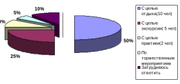 | 3. С какой целью Вы посещаете Патриаршие сады | 10 чел. – 50% | 5 чел. – 20% | 2 чел. – 10% | 1 чел. – 5% | 2 чел. – 10% |