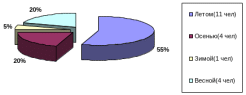 | 2. В какое время года Вы посещаете данный объект | 11чел. – 55% | 4 чел. – 20% | 1 чел. – 5% | 4 чел. – 20% | - |