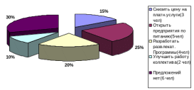 По результатам проведенного анализа было выяснено, что, по мнению респондентов, что на территории для полного развития Патриарших садов, как экологического центра г.Владимира, не хватает предприятий по питанию, разработать развлекательные программы по отдыху, ведь если на территории предприятия например, сделать катание на лошадях, кормление лошадей, разведение кроликов, ведь жители и гости города Владимира, захотят более часто посещать данный объект. Так , же респонденты предлагают снизить цены на платные услуги, сумма входа на территорию Патриарших садов на 1 человека составляет – 50 рублей, можно сделать скидки например для групп более – 10 человек, или например каждый 5ый человек бесплатно, ведь не мало значимо для нас цена, и люди глядя на такие акции и скидки потянутся, ведь не всякий школьник и студент в силе оплатить вход. Так же, опрашиваемые считают, что нужно улучшить работу коллектива, для тех посетителей, кто посещает данный объект с целью экскурсии, по желанию можно оплатить экскурсовода, но по мнению посетителей экскурсовод не внятно и не интересно рассказывает.
