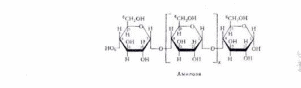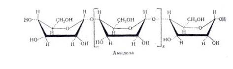 Различна и химическая структура амилозы и амилопектина. Молекулы первой, как правило, строго линейны. В них остатки -D-глюкопиранозы связаны друг с другом исключительно -1,4-глюкозидными связями, т.е. кислородные мостики возникают за счёт гликозидного гидроксила 1-го атома одной молекулы -D-глюкопиранозы и спиртового гидроксила при 4-м атоме другой: