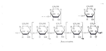 Амилопектин имеет сферические молекулы с радиусом вращения от 82 до 255 нм. Их сферическая форма обеспечивается тем, что молекула составлена из множества (несколько сотен) коротких полигликозидных цепочек, каждая из которых в среднем содержит 20 остатков -D - глюкопиранозы. В пределах каждой короткой цепи глюкозные остатки соединены -1,4 гликозидными связями. Друг с другом цепи соединяются посредством -1,6 гликозидных связей. Строение этого разветлённого участка молекулы амилопектина таково: